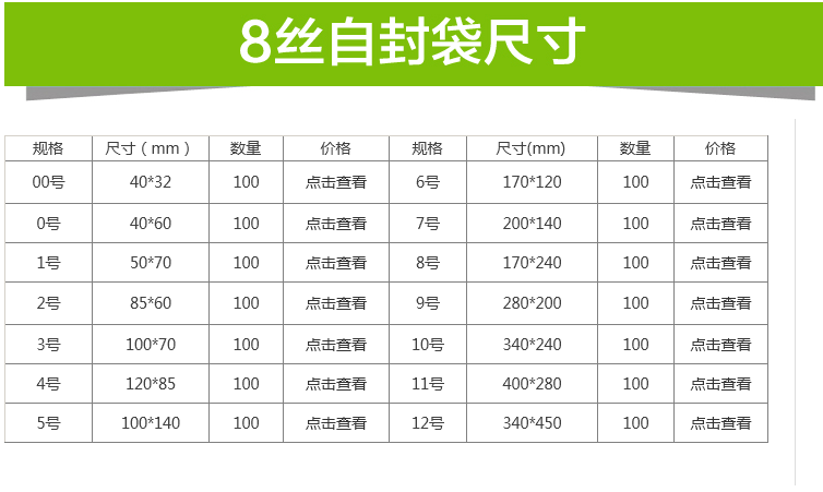 紅色外包裝)厚度為單面4絲 雙面8絲 每包數(shù)量100個(gè) 可能會(huì)發(fā)生正負(fù)差(0-4號(hào)可能差別大一點(diǎn) 5-12號(hào)差別很小 5號(hào)以上差別幾率很小)